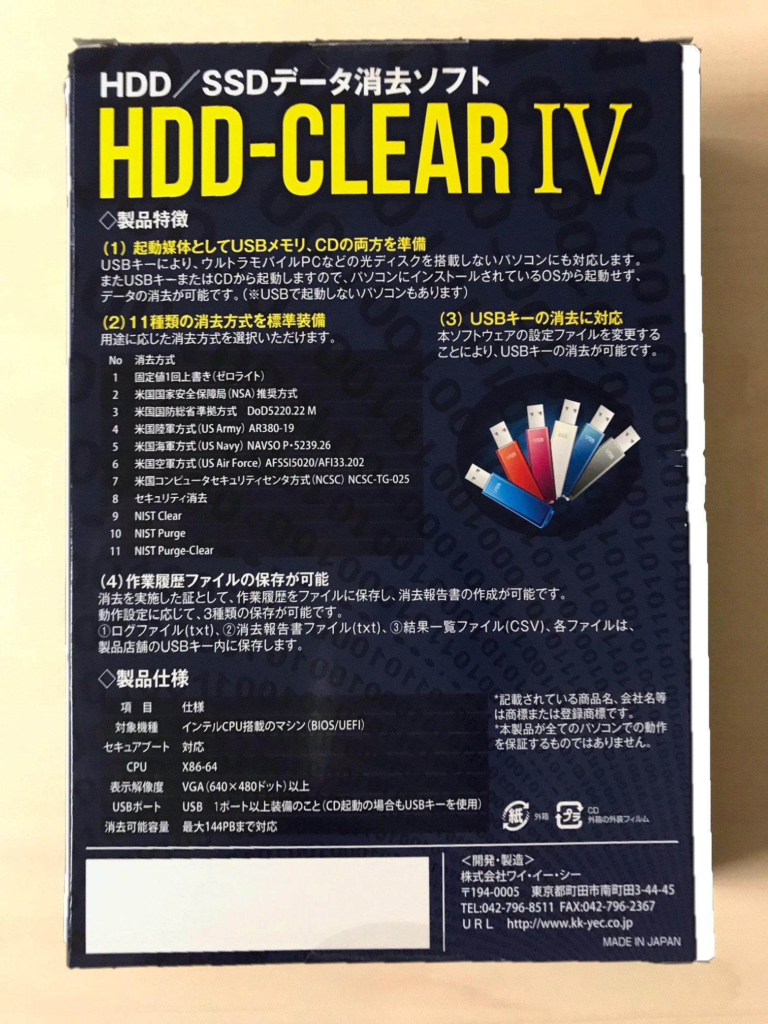 | 商品仕様 | ・対象機種 インテルCPU搭載のマシン(BIOS/UEFI) ・セキュアブート 対応 ・CPU X86-64 ・表示解像度 VGA(640×480ドット)以上 ・USBポート USB 1ポート以上 ・消去可能容量 最大144PB ・USBキー×1 |