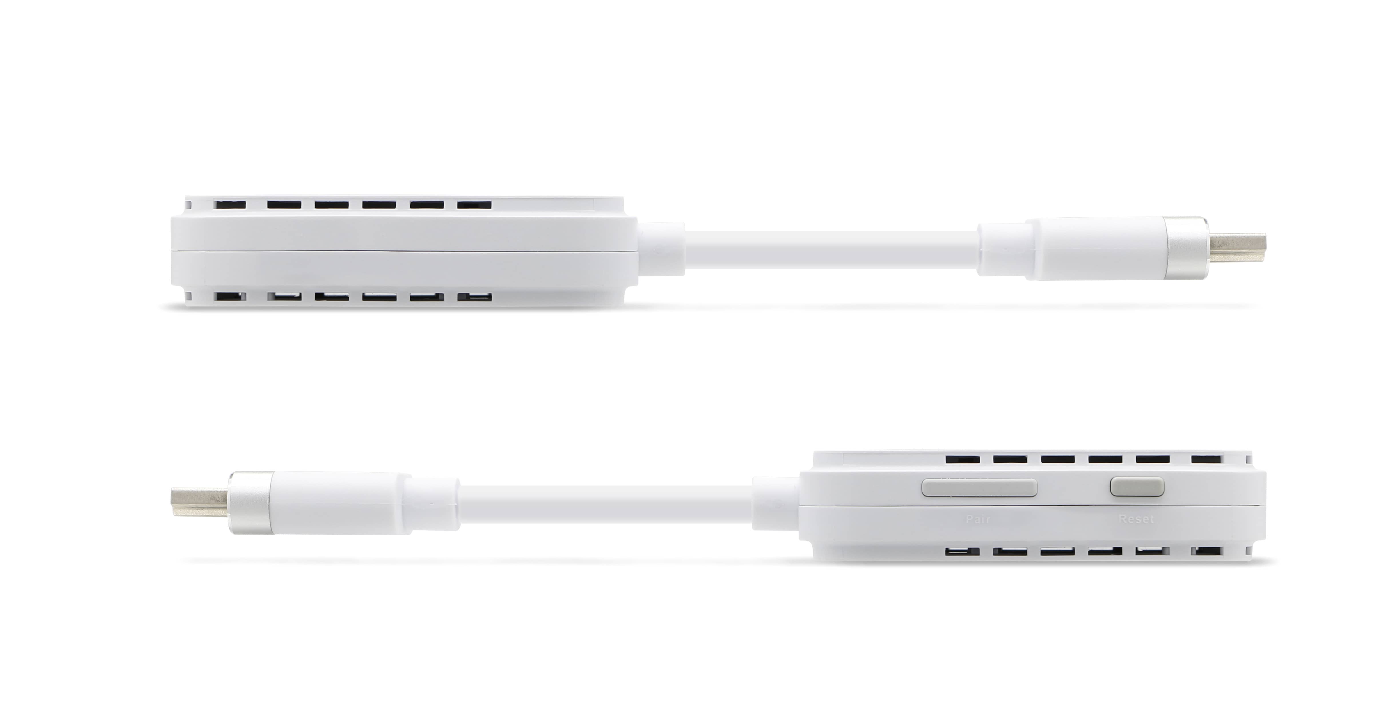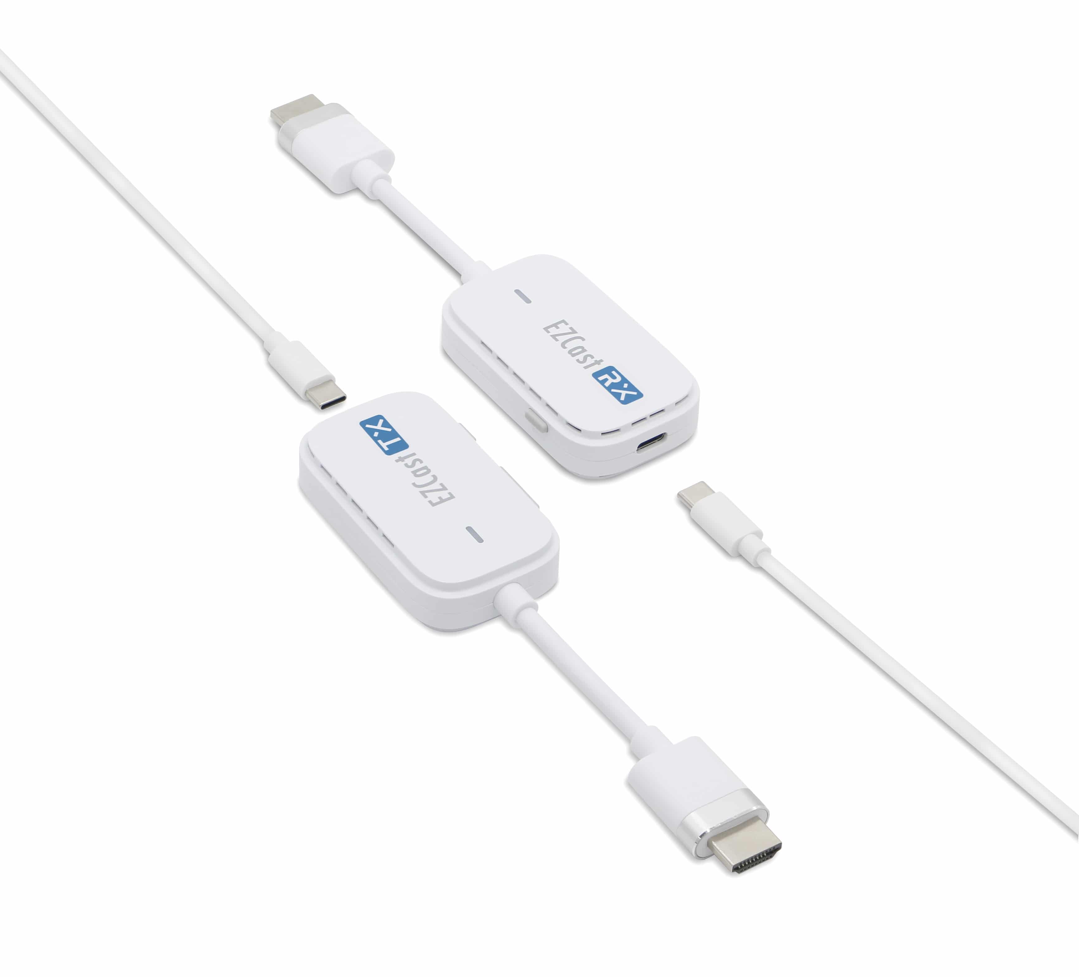 EZCast Pocketは、PCやタブレットなどの映像・音声をワイヤレスでモニターに伝送(ミラーリング)できる製品です。面倒な設定作業は一切必要なく、PCやタブレットに送信機(TX)を、モニターに受信機(RX)を接続するだけで簡単に使用できます。