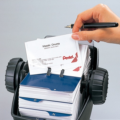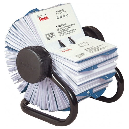 | 商品仕様 | ●固定式・差替式/差替式 ●色/ブラック ●寸法/W163×D140×H188mm ●収容枚数/400枚 ●リフィル枚数/200枚 ●材質/脚部:アルミ、グリップ:ABS、スリーブ:PS・紙、インデックス:紙 ●重量/610g ●付属品/インデックスタブ(50音:44枚、アルファベット:24枚、未記入:10枚) ●その他仕様/●機構:ロータリー型 ●備考/※収容数はスリーブに名刺2枚入れた時の枚数です。 ●シリーズ名/ROLODEX |