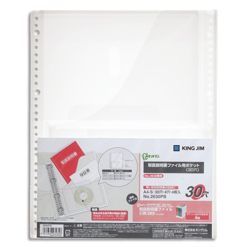 キングジム スキットマン 取扱説明書ファイル用ポケット A4タテ 30穴(2穴・4穴兼用) 2630PB 1パック(4枚)
