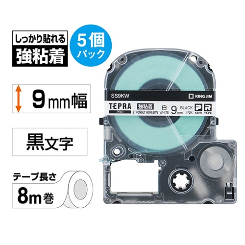 キングジム テプラ PRO テープカートリッジ 強粘着 9mm 白/黒文字 SS9KW-5P 1パック(5個)