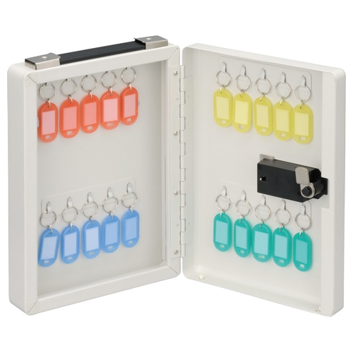 商品仕様 | ●収容数/20個吊 ●施錠方法/4桁ダイヤル式 ●寸法/W200×D75×H284mm ●材質/スチール、PVC樹脂、ABS樹脂 ●重量/1400g ●付属品/キーホルダー、緊急解除キー、木ネジ |