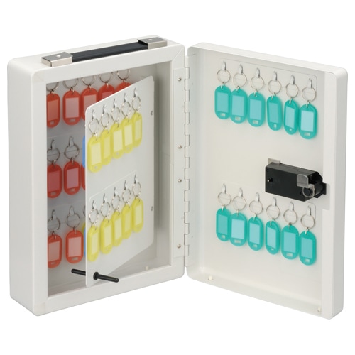 商品仕様 | ●収容数/50個吊 ●施錠方法/4桁ダイヤル式 ●寸法/W223×D105×H327mm ●材質/スチール、PVC樹脂、ABS樹脂 ●重量/2600g ●付属品/キーホルダー、緊急解除キー、木ネジ |