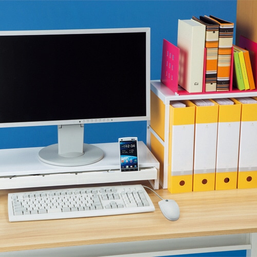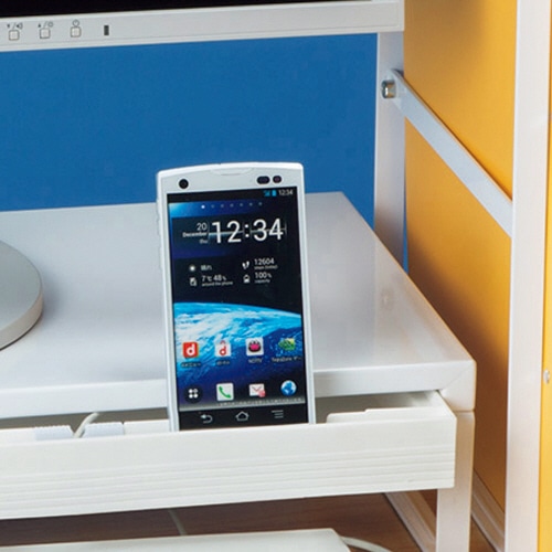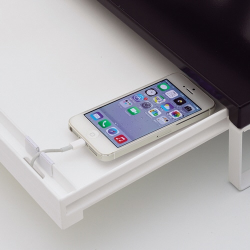 ●充電コード用の穴が開いている、スマホスタンド機能も付いた引き出し付・白色の机上台です。小物収納としても便利。