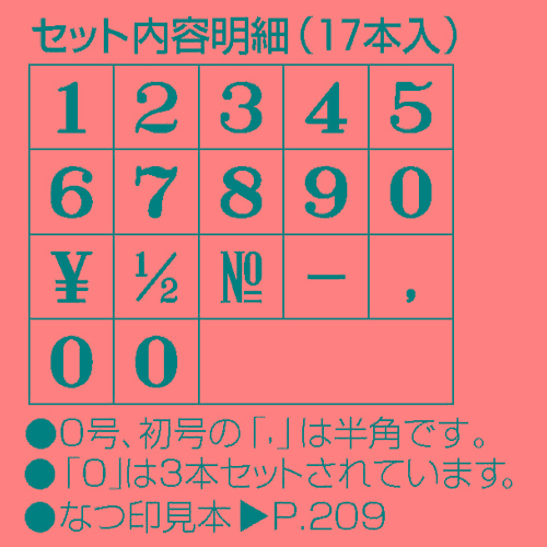 商品仕様 | ●印面内容/「1」「2」「3」「4」「5」「6」「7」「8」「9」「0」「¥」「1/2」「No」「-」「カンマ(記号)」 ●サイズ/5号 ●書体/ゴシック体 ●印面サイズ/3.2×2.3mm ●寸法/W71.2×D71.2×H71mm ●材質/PS ●重量/約115g ●その他仕様/●連結式 ●印面セット内容:「1」「2」「3」「4」「5」「6」「7」「8」「9」「0」「¥」「1/2」「No」「-」「カンマ(記号)」、「0」のみ3本入ってます |