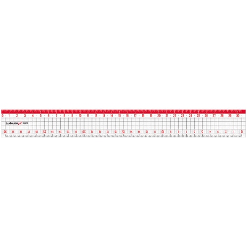 商品仕様 | ●目盛/30cm ●寸法/幅35×長さ310×厚さ2mm ●材質/PMMA ●色/透明(表面:赤印字、裏面:黒印字) |