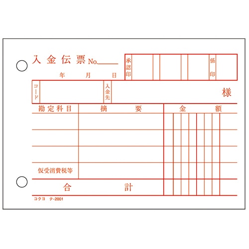 コクヨ 入金伝票(仮受け消費税額表示入り) B7ヨコ型 白上質紙 100枚 テ-2001N 1冊