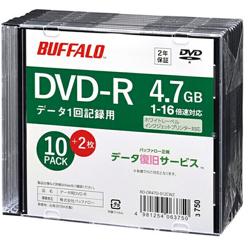 バッファロー DVD-R PCデータ用 4.7GB 16倍速 ホワイトワイドプリンタブル スリムケース 10枚+2枚 RO-DR47D-012CWZ 1パック