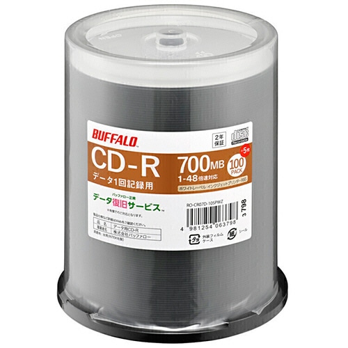 バッファロー CD-R PCデータ用 700MB 48倍速 ホワイトワイドプリンタブル スピンドルタイプ 100枚+5枚 RO-CR07D-105PWZ 1パッ