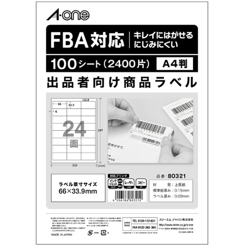 ●FBAに対応したラベルです。キレイにはがせるタイプ。A4・マット紙、24面(66×33.9mm)・100シートです。