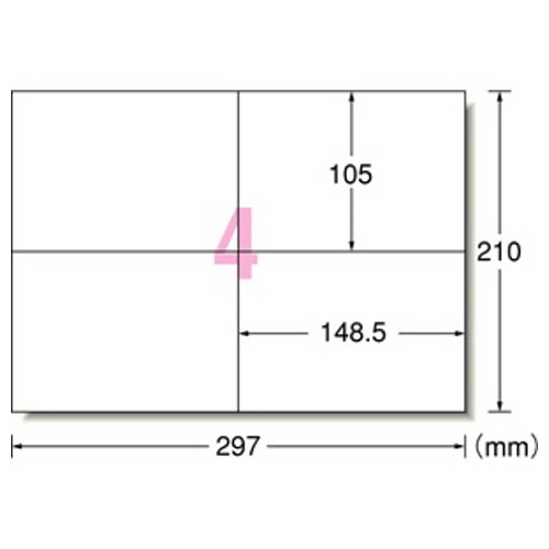 | 商品仕様 | ●サイズ/A4 ●シートサイズ/210×297mm ●ラベルサイズ/148.5×105mm ●面付け/4面(2列×2段) ●紙質/上質紙 ●ラベルの厚み/0.09mm ●総厚み/0.15mm ●白色度/90% ●紙色/ホワイト ●再剥離/○ ●その他仕様/●マット紙 ●備考/※コピー・レーザープリンター使用の場合は厚紙モード・手差し給紙でお使いください。お使いの機種によっては対応しない場合がございます。 ※インクジェットプリンタはにじみが生じる場合がございます。 |