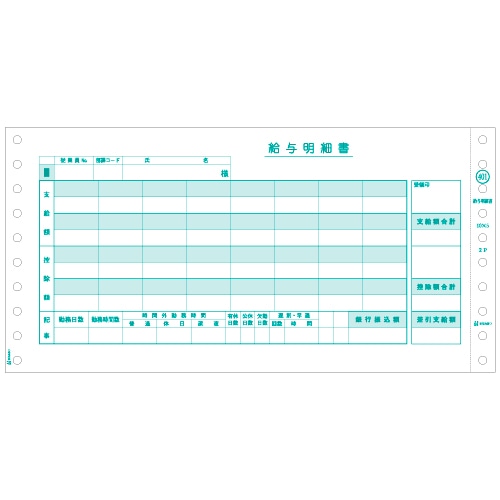 商品仕様 | ●様式/給与明細書 ●用紙タイプ/連続 ●寸法/254×127mm ●ミシン目切り離し後サイズ/241×127mm ●紙質/ノーカーボン紙 ●刷色/青緑 ●複写枚数/2枚複写 ●複写内訳/(1枚目・2枚目)給与明細書 ●フィーダ穴/10穴 ●その他仕様/●サイズ(インチ表記):10×5インチ ●ミシン目切り離し後サイズ:9_1/2×5インチ ●備考/※対応パッケージソフトの最新情報はメーカーホームページをご覧ください。 |