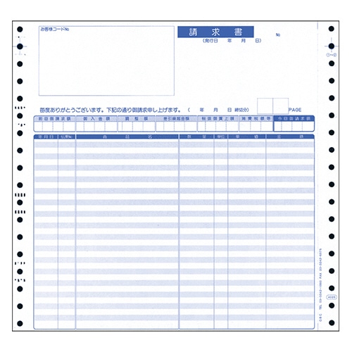 | 商品仕様 | ●様式/明細請求書 ●用紙タイプ/連続 ●サイズ/Y9.5×T9 ●刷色/1枚目:コバルトブルー、2枚目:ブルー ●複写枚数/2枚 ●複写内訳/1枚目:請求書、2枚目:請求書(伝票毎の明細内容と金額、合計金額が印字されます) ●対応ソフト/商奉行V ERP10、商奉行i10、商奉行V ERP8、商奉行i8、商奉行V ERP、商奉行i、商奉行21シリーズ |