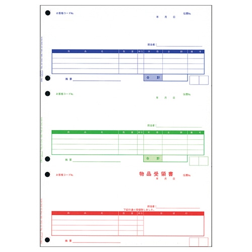 商品仕様 | ●様式/納品書 ●用紙タイプ/単票 ●サイズ/A4タテ ●寸法/297×210mm ●ミシン目切り離し後サイズ/99×210mm ●面付/3面 ●刷色/1段目:ネイビー、2段目:グリーン、3段目:レッド ●とじ穴/6穴 ●対応ソフト/商奉行V ERP10、商奉行i10、商奉行V ERP8、商奉行i8、商奉行V ERP、商奉行i、商奉行21シリーズ、EC奉行21Ver.IIASP ●備考/※製品上選択したタイトルを1段目、2段目に印字 |
