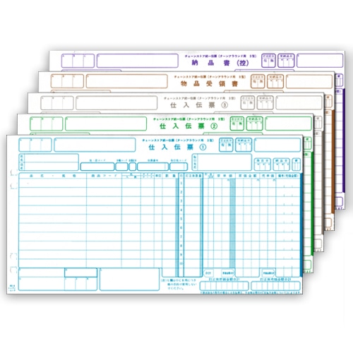商品仕様 | ●様式/チェーンストア統一伝票(ターンアラウンド3型) ●用紙タイプ/連続 ●サイズ/ターンアラウンド3型 ●寸法/12×6インチ ●ミシン目切り離し後サイズ/11×6インチ ●紙質/ノーカーボン紙 ●刷色/1枚目:青、2枚目:緑、3枚目:灰、4枚目:茶、5枚目:紫 ●複写枚数/5枚 ●複写内訳/1枚目:仕入伝票1、2枚目:仕入伝票2、3枚目:仕入伝票3、4枚目:物品受領書、5枚目:納品書(控) ●フィーダ穴/12穴 ●とじ穴/2穴 ●とじ穴間隔/80mm |