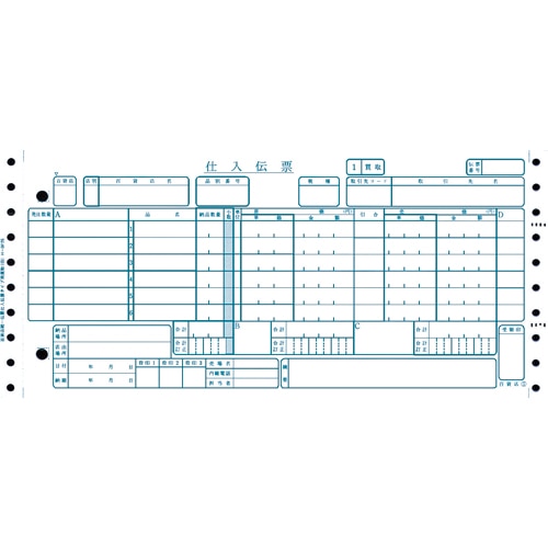 商品仕様 | ●様式/百貨店統一伝票(タイプ買取旧) ●用紙タイプ/連続 ●サイズ/タイプ買取旧 ●寸法/11×5インチ ●ミシン目切り離し後サイズ/10×5インチ ●紙質/ノーカーボン紙 ●刷色/1枚目:紺、2枚目:緑、3枚目:黒、4枚目:茶、5枚目:青、6枚目:紫 ●複写枚数/6枚 ●複写内訳/1枚目:仕入伝票、2枚目:仕入伝票、3枚目:仕入伝票、4枚目:仕入伝票、5枚目:納品伝票、6枚目:納品伝票 ●フィーダ穴/10穴 ●とじ穴/2穴 ●とじ穴間隔/80mm |