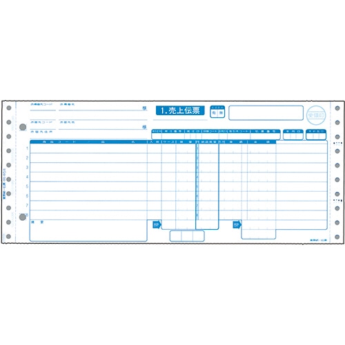 商品仕様 | ●様式/業際統一伝票(タイプ用) ●用紙タイプ/連続 ●サイズ/12×5インチ ●寸法/12×5インチ ●ミシン目切り離し後サイズ/11×5インチ ●紙質/ノーカーボン紙(青発色) ●刷色/1枚目:紺、2枚目:灰、3枚目:茶、4枚目:緑、5枚目:橙 ●複写枚数/5枚 ●複写内訳/1枚目:売上伝票、2枚目:請求明細書、3枚目:仕入伝票、4枚目:納品案内書、5枚目:物品受領書 ●フィーダ穴/10穴 ●とじ穴/2穴 ●とじ穴間隔/80mm |