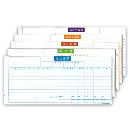 商品仕様 | ●様式/スポーツ統一伝票(タイプ用1型) ●用紙タイプ/連続 ●サイズ/タイプ用1型 ●寸法/12×5インチ ●ミシン目切り離し後サイズ/11×5インチ ●紙質/ノーカーボン紙 ●刷色/1枚目:青、2枚目:緑、3枚目:茶、4枚目:橙、5枚目:紫 ●複写枚数/5枚 ●複写内訳/1枚目:売上伝票、2枚目:納品書、3枚目:仕入伝票、4枚目:物品受領書、5枚目:請求明細書 ●フィーダ穴/10穴 ●とじ穴/2穴 ●とじ穴間隔/80mm |