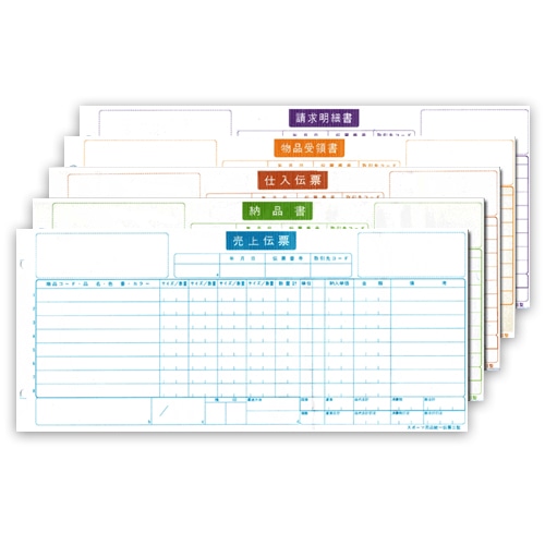 商品仕様 | ●様式/スポーツ統一伝票(タイプ用2型) ●用紙タイプ/連続 ●サイズ/タイプ用2型 ●寸法/12×5インチ ●ミシン目切り離し後サイズ/11×5インチ ●紙質/ノーカーボン紙 ●刷色/1枚目:青、2枚目:緑、3枚目:茶、4枚目:橙、5枚目:紫 ●複写枚数/5枚 ●複写内訳/1枚目:売上伝票、2枚目:納品書、3枚目:仕入伝票、4枚目:物品受領書、5枚目:請求明細書 ●フィーダ穴/10穴 ●とじ穴/2穴 ●とじ穴間隔/80mm |