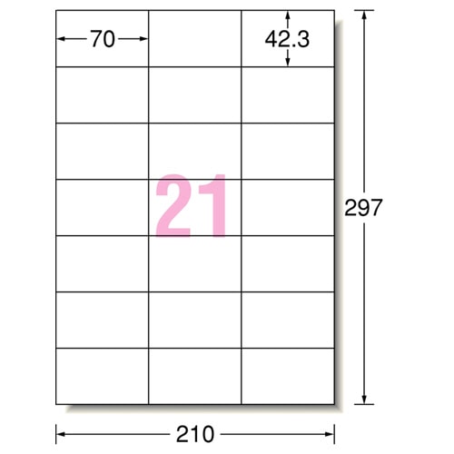 | 商品仕様 | ●サイズ/A4 ●シートサイズ/210×297mm ●ラベルサイズ/42.3×70mm ●面付け/21面 ●坪量/125g/m2 ●ラベルの厚み/0.09mm ●総厚み/0.15mm ●白色度/89% ●紙色/ホワイト ●重量/848g ●備考/※顔料インクの場合、インクの乾燥には時間がかかります。 |