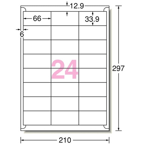 | 商品仕様 | ●サイズ/A4 ●シートサイズ/210×297mm ●ラベルサイズ/33.9×66mm ●面付け/24面 ●坪量/125g/m2 ●ラベルの厚み/0.09mm ●総厚み/0.15mm ●白色度/89% ●紙色/ホワイト ●重量/848g ●備考/※顔料インクの場合、インクの乾燥には時間がかかります。 |