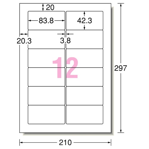 | 商品仕様 | ●サイズ/A4 ●シートサイズ/210×297mm ●ラベルサイズ/42.3×83.8mm ●面付け/12面 ●坪量/120g/m2 ●ラベルの厚み/0.07mm ●総厚み/0.13mm ●白色度/81% ●紙色/白無地 ●その他仕様/●手書き対応 ●備考/※厚紙モード、手差し給紙でお使いください。 ※お使いの機種によっては対応しない場合がございます。 |