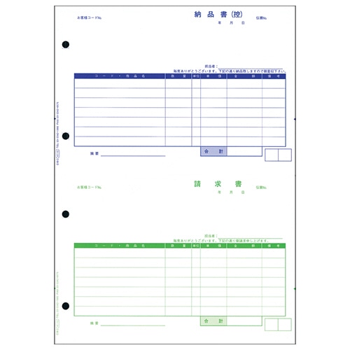 | 商品仕様 | ●様式/納品書 ●用紙タイプ/単票 ●サイズ/A4タテ ●寸法/297×210mm ●ミシン目切り離し後サイズ/148.5×210mm ●面付/2面 ●刷色/1枚目-1段目:ネイビー、1枚目-2段目:グリーン、2枚目-1段目:ブルー、2枚目-2段目:レッド ●複写枚数/2枚 ●複写内訳/1枚目(1段目):納品書(控)、1枚目(2段目):請求書、2枚目(1段目):納品書、2枚目(2段目):物品受領書 ●とじ穴/4穴 ●対応ソフト/商奉行V ERP10、商奉行i10、商奉行V ERP8、商奉行i8、商奉行V ERP、商奉行i、商奉行21シリーズ |