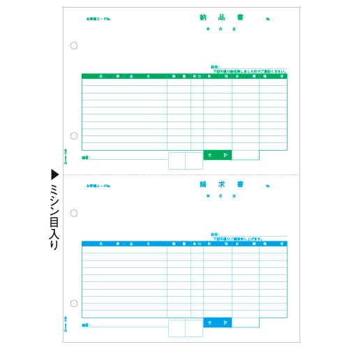 | 商品仕様 | ●様式/納品書 ●用紙タイプ/カット紙 ●サイズ/A4タテ ●寸法/297×210mm ●ミシン目切り離し後サイズ/148.5×210mm ●面付/2面 ●紙質/上質紙 ●複写内訳/1段目:納品書、2段目:請求書 ●とじ穴/4穴 ●とじ穴間隔/80mm ●坪量/70g/m2 ●厚み/約0.09mm ●白色度/80% ●備考/※対応パッケージソフトの最新情報はメーカーホームページをご覧ください。 ※2021年12月頃より順次、原紙の変更に伴い白色度が約78%→約80%に変更になります。 |