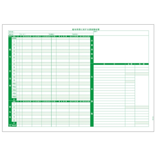 | 商品仕様 | ●様式/源泉徴収簿(令和6年分) ●用紙タイプ/カット紙 ●サイズ/A4 ●寸法/210×297mm ●刷色/緑 ●複写枚数/単票 ●対応ソフト/PCA給与hyper、PCA給与DX、給与じまんDX ●その他仕様/●50名分 |
