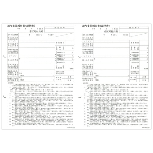 商品仕様 | ●様式/源泉徴収簿件賃金台帳、給与支払報告書(総括表) ●用紙タイプ/カット紙 ●サイズ/A4 ●寸法/210×297mm ●刷色/源泉徴収簿兼賃金台帳:緑、給与支払報告書(総括表):黒 ●複写枚数/単票 ●対応ソフト/弥生給与 24+クラウド、やよいの給与計算 24+クラウド ●その他仕様/●50人用 ●セット内容:令和6年分レーザープリンタ用源泉徴収簿兼賃金台帳×50枚、給与支払報告書総括表(2面)×25枚 |