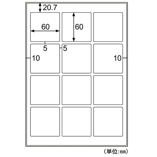 | 商品仕様 | ●サイズ/A4 ●シートサイズ/210×297mm ●ラベルサイズ/60×60mm ●面付け/12面 ●カット内容/角丸正方形 ●総厚み/0.23mm ●紙色/白 ●材質/PETフィルム ●水に強い/○ ●屋外用/○ ●その他仕様/●半光沢フィルムホワイト ●備考/※機種によっては対応しない場合がございます。 |