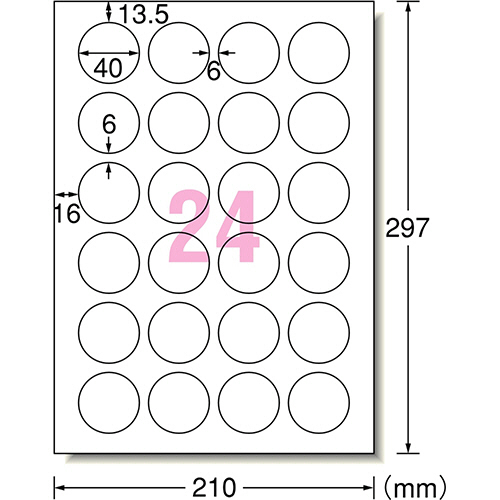 | 商品仕様 | ●サイズ/A4 ●シートサイズ/210×297mm ●面付け/24面 ●カット内容/丸型 ●紙質/上質紙 ●坪量/120g/m2 ●ラベルの厚み/0.07mm ●総厚み/0.13mm ●白色度/82% ●紙色/ホワイト ●強粘着/○ ●その他仕様/●ラベルサイズ:Φ40mm ●強粘着タイプ、マット紙、手書き対応 ●備考/※厚紙モード、手差し給紙でお使いください。 ※お使いの機種によっては対応しない場合がございます。 |