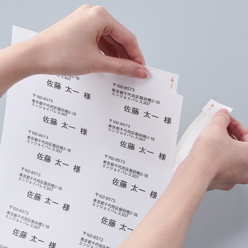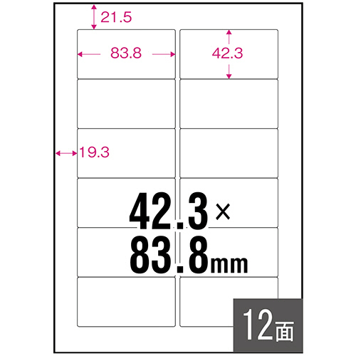 | 商品仕様 | ●サイズ/A4 ●ラベルサイズ/83.8×42.3mm ●面付け/12面 ●カット内容/四辺余白付(角丸) ●紙質/上質紙 ●総厚み/0.145mm ●白色度/約92% |