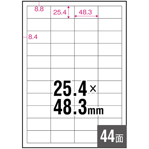 | 商品仕様 | ●サイズ/A4 ●ラベルサイズ/48.3×25.4mm ●面付け/44面 ●カット内容/四辺余白付 ●紙質/上質紙 ●総厚み/0.145mm ●白色度/約92% |