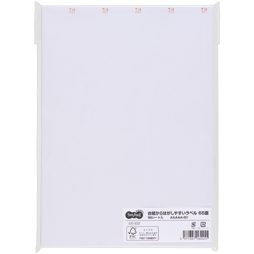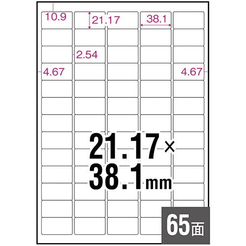 | 商品仕様 | ●サイズ/A4 ●ラベルサイズ/38.1×21.17mm ●面付け/65面 ●カット内容/四辺余白付 ●紙質/上質紙 ●総厚み/0.145mm ●白色度/約92% |