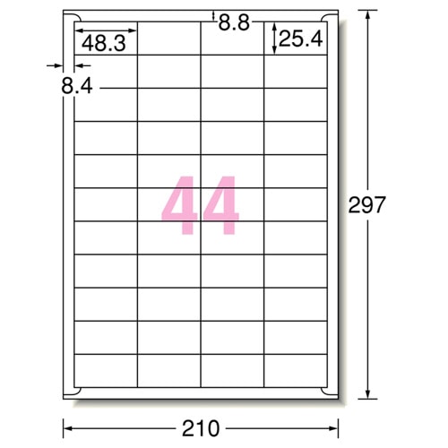 | 商品仕様 | ●サイズ/A4 ●シートサイズ/210×297mm ●ラベルサイズ/25.4×48.3mm ●面付け/44面 ●紙質/上質紙+レーザー専用塗工 ●坪量/120g/m2 ●ラベルの厚み/0.07mm ●総厚み/0.13mm ●白色度/82% ●紙色/ホワイト ●重量/188g ●備考/※厚紙モード、手差し給紙でお使いください。 ※お使いの機種によっては対応しない場合がございます。 |