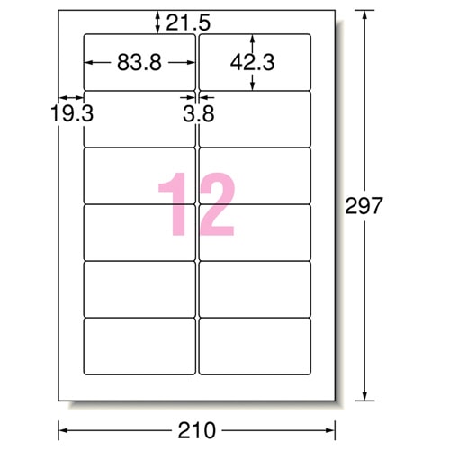 | 商品仕様 | ●サイズ/A4 ●シートサイズ/210×297mm ●ラベルサイズ/42.3×83.8mm ●面付け/12面 ●紙質/上質紙 ●坪量/120g/m2 ●ラベルの厚み/0.07mm ●総厚み/0.13mm ●白色度/81% ●紙色/ホワイト ●重量/188g |