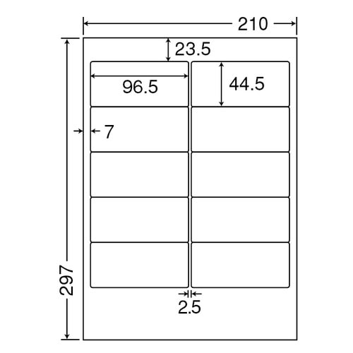 | 商品仕様 | ●サイズ/A4 ●シートサイズ/210×297mm ●ラベルサイズ/44.5×96.5mm ●面付け/10面 ●カット内容/タテ5面×ヨコ2面 ●坪量/124g/m2 ●ラベルの厚み/0.078mm ●総厚み/0.134mm ●白色度/約91% ●紙色/白 ●備考/※品質改良のため、紙質を予告なく変更する場合がございます。 ※厚紙モード、手差し給紙でお使いください。 ※お使いの機種によっては対応しない場合がございます。 ※インクジェットプリンタの場合、顔料インクには非対応です。 |