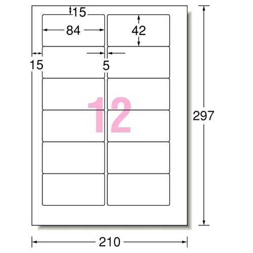 商品仕様 | ●サイズ/A4 ●シートサイズ/210×297mm ●ラベルサイズ/42×84mm ●面付け/12面 ●坪量/120g/m2 ●ラベルの厚み/0.07mm ●総厚み/0.13mm ●白色度/81% ●紙色/白無地 ●その他仕様/●手書き対応 ●備考/※厚紙モード、手差し給紙でお使いください。 ※お使いの機種によっては対応しない場合がございます。 |