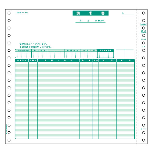 商品仕様 | ●様式/請求書 ●用紙タイプ/連続 ●寸法/241.3×228.6mm ●ミシン目切り離し後サイズ/224×229mm ●紙質/ノーカーボン紙 ●刷色/青緑 ●複写枚数/2枚複写 ●複写内訳/1枚目:請求書、2枚目:請求書 ●フィーダ穴/18穴 ●その他仕様/●サイズ:9_1/2×9インチ ●ミシン目切り離し後サイズ:8_8/10×9インチ ●備考/※対応パッケージソフトの最新情報はメーカーホームページをご覧ください。 ※罫線内容はGB481と同じです。 |