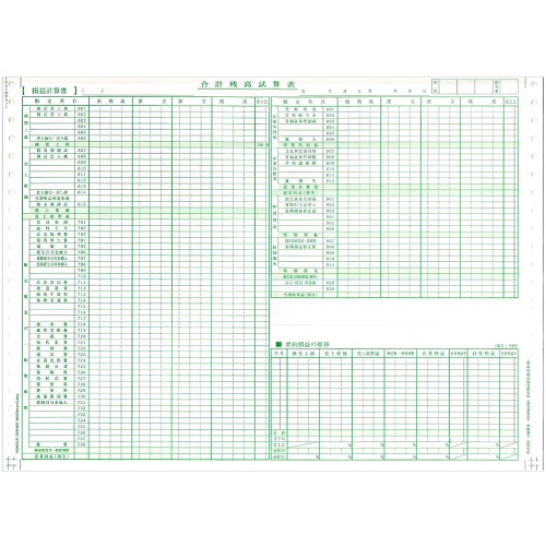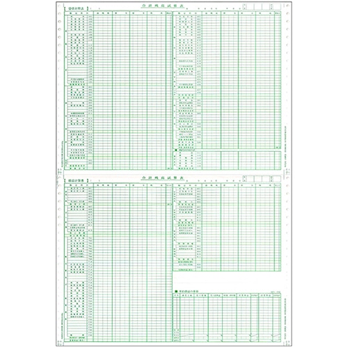 | 商品仕様 | ●様式/合計残高試算表(一般・科目印刷) ●用紙タイプ/連帳 ●寸法/15×22インチ ●ミシン目切り離し後サイズ/368×279mm ●紙質/上質紙 ●刷色/緑 ●複写枚数/1枚 ●フィーダ穴/22穴 ●重量/1kg ●対応ソフト/SMILEα AD 財務管理システム ●その他仕様/●連量:55kg |