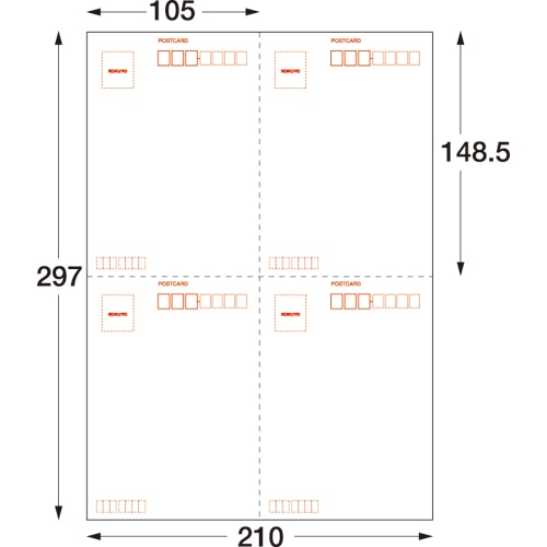 商品仕様 | ●サイズ/A4 ●シートサイズ/210×297mm ●カードサイズ/105×148.5mm ●面付け/4面 ●紙質/マット紙 ●紙色/白 ●坪量/180g/m2 ●カードの厚み/0.22mm ●白色度/約98%(ISO) ●その他仕様/●両面マット紙 ●両面印刷用紙 ●郵便番号枠・切手枠あり |