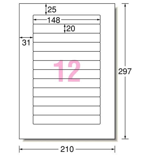| 商品仕様 | ●サイズ/A4 ●シートサイズ/210×297mm ●ラベルサイズ/20×148mm ●面付け/12面 ●坪量/125g/m2 ●ラベルの厚み/0.09mm ●総厚み/0.15mm ●白色度/89% ●紙色/ホワイト ●重量/79g |