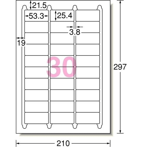 商品仕様 | ●サイズ/A4 ●シートサイズ/210×297mm ●ラベルサイズ/25.4×53.3mm ●面付け/30面 ●紙質/上質紙+レーザー専用塗工 ●坪量/120g/m2 ●ラベルの厚み/0.07mm ●総厚み/0.13mm ●白色度/82% ●紙色/ホワイト ●重量/870g |