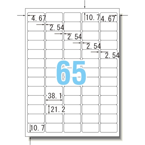 商品仕様 | ●サイズ/A4 ●シートサイズ/210×297mm ●ラベルサイズ/21.2×38.1mm ●面付け/65面 ●坪量/139g/m2 ●ラベルの厚み/0.07mm ●総厚み/0.15mm ●白色度/約85% ●重量/9g |