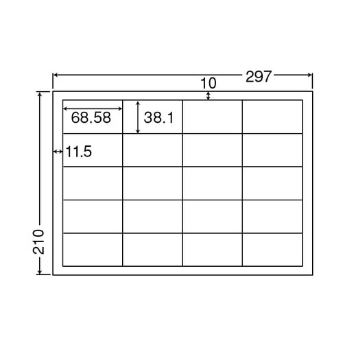商品仕様 | ●サイズ/A4 ●シートサイズ/210×297mm ●ラベルサイズ/38.1×68.58mm ●面付け/20面 ●カット内容/タテ4面×ヨコ5面 ●坪量/124g/m2 ●ラベルの厚み/0.078mm ●総厚み/0.134mm ●白色度/約91% ●紙色/白 ●備考/※品質改良のため、紙質を予告なく変更する場合がございます。 ※厚紙モード、手差し給紙でお使いください。 ※お使いの機種によっては対応しない場合がございます。 ※インクジェットプリンタの場合、顔料インクには非対応です。 |