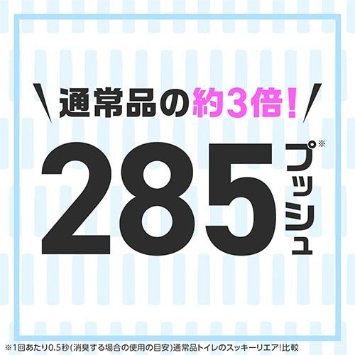 | 商品仕様 | ●香り/ソープの香り ●内容量/265ml ●使用推奨空間/トイレ ●成分/エタノール、水、植物抽出物(消臭成分)、香料 ●その他仕様/●生産国:日本 ●シリーズ名/Sukki-ri!(スッキーリ!) |