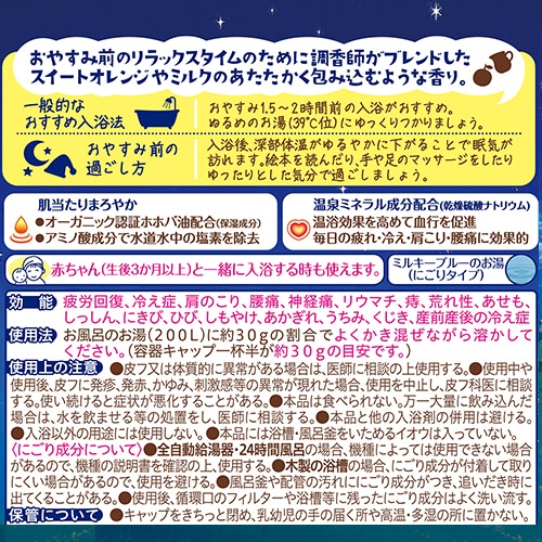 ●おやすみ前のリラックスタイムのために調香師がブレンドしたスイートオレンジやミルクのあたたかく包み込むような香りの入浴剤です。