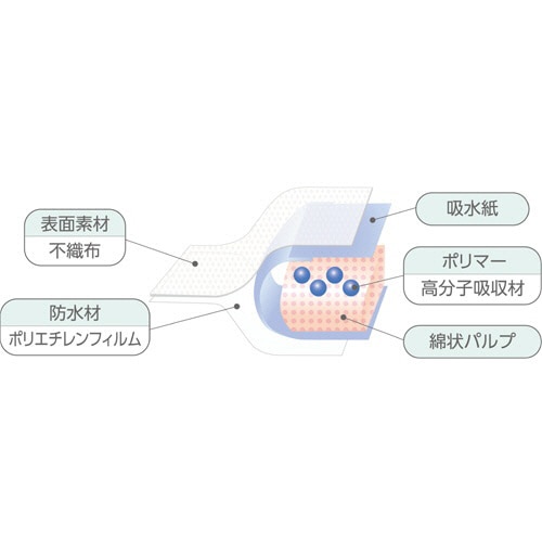 | 商品仕様 | ●タイプ/使いきり ●寸法/33×45cm ●材質/表面:ポリプロピレン不織布、防水材:ポリエチレンフィルム、吸収材:吸水紙・高吸収ポリマー・綿状パルプ ●その他仕様/●吸収量:約300cc |