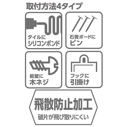 ●取付方法は選べる4タイプ(シリコンボンド・ピン・木ネジ・引掛け)。ボンド、ピン、木ネジは付属しています。